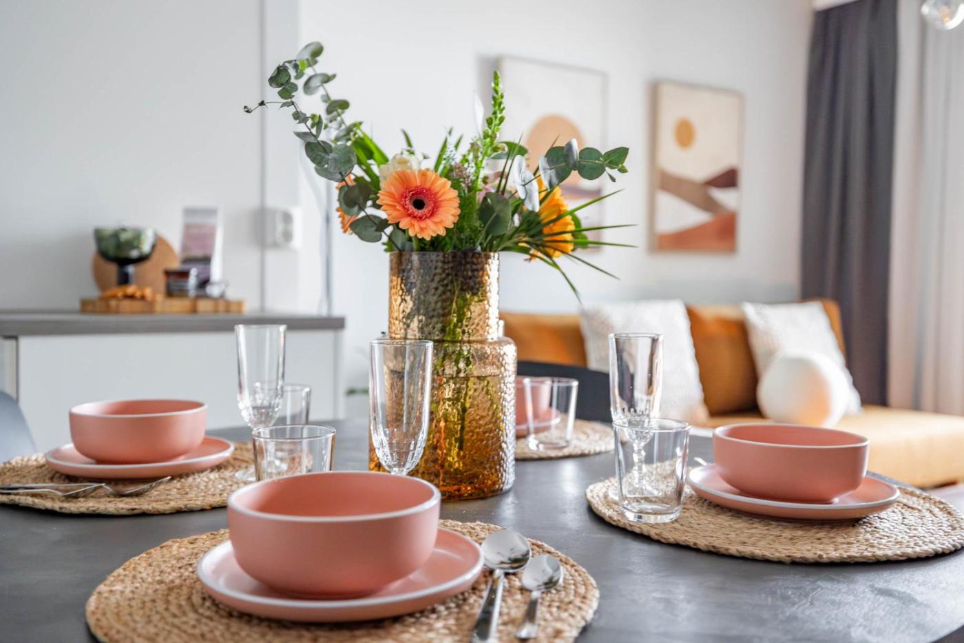 One-Bedroom Apartment. This apartment comes with 1 living room, 1 separate bedroom and 1 bathroom with a shower and free toiletries. Meals can be prepared in the well-fitted kitchen, which features a stovetop, a refrigerator, a dishwasher and kitchenware. This apartment is air-conditioned and has a seating area with a flat-screen TV, a washing machine, a tea and coffee maker, a dining area, as well as a wardrobe. The unit has 2 beds.